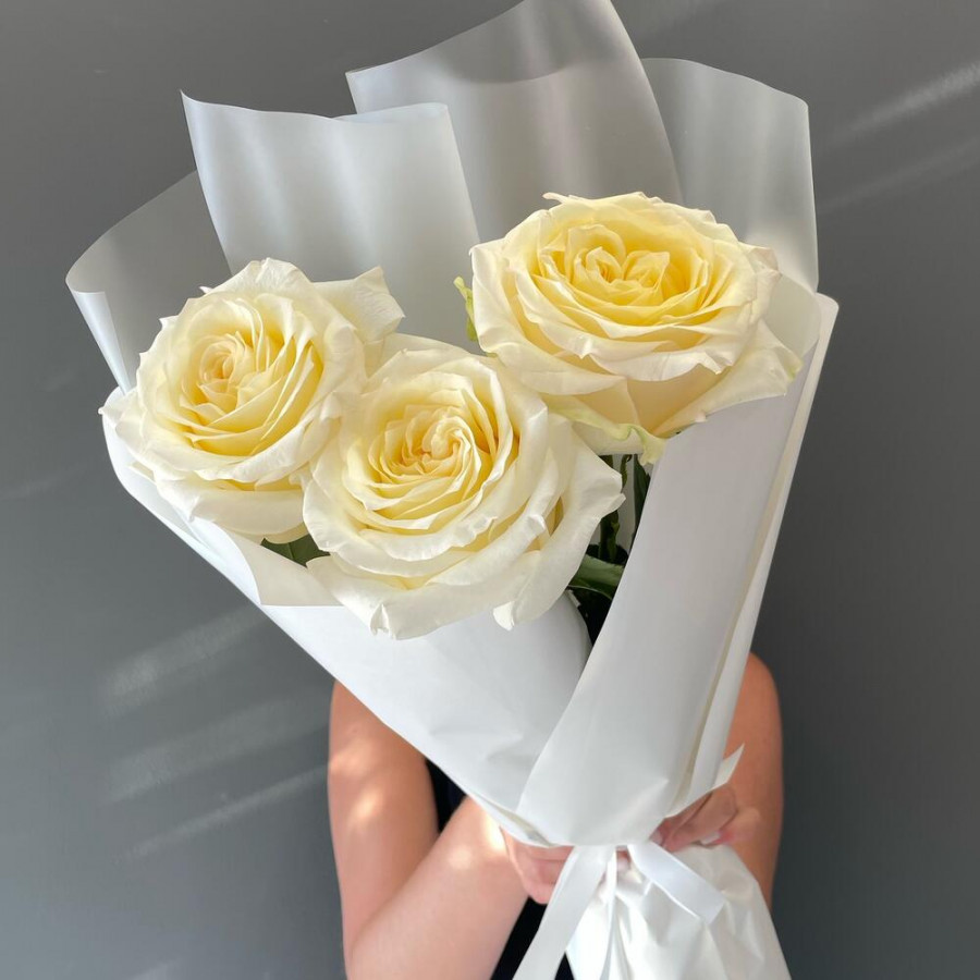 На фото букет из 3 кремовых роз. В составе: роза 3 шт, дизайнерская упаковка 1 шт, атласная лента 1 шт, . Все цветы свежие и ароматные, букет красиво оформлен и отлично подходит для подарка. Доступна доставка цветов или самовывоз.